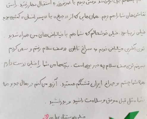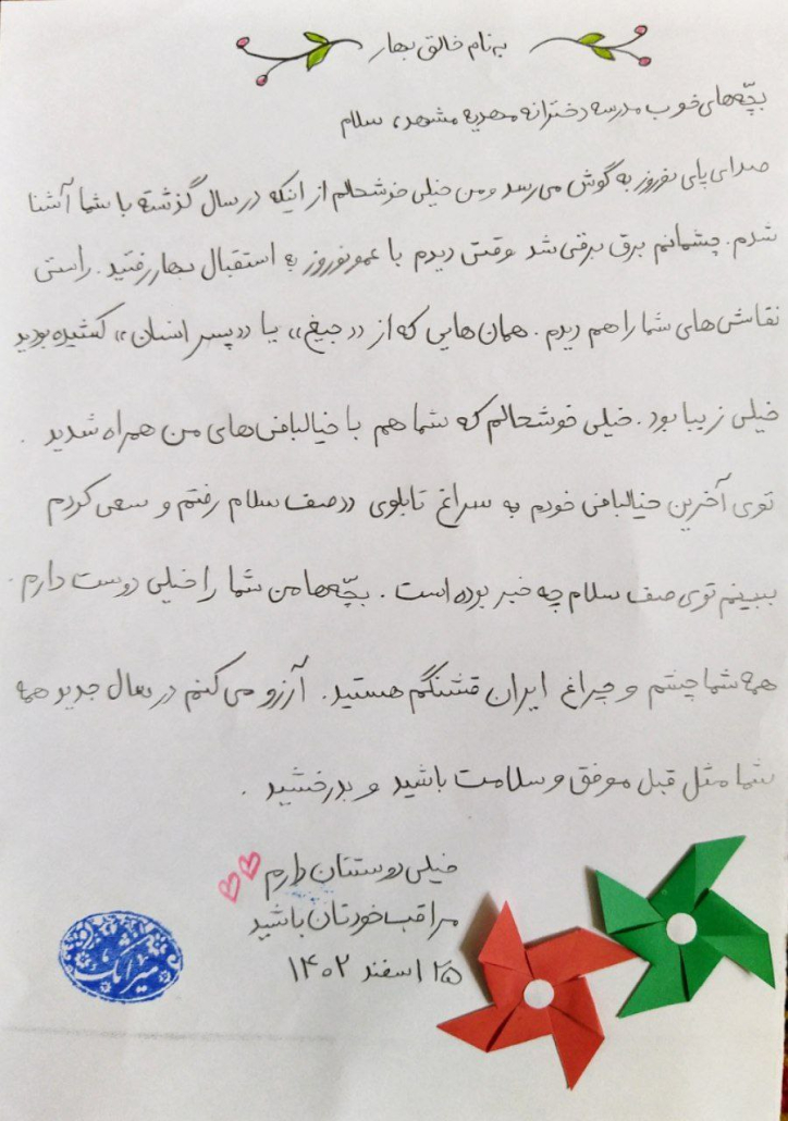 تبریک نوروزی دانش‌آموز دبستان مهدیه به میراثک عزیز